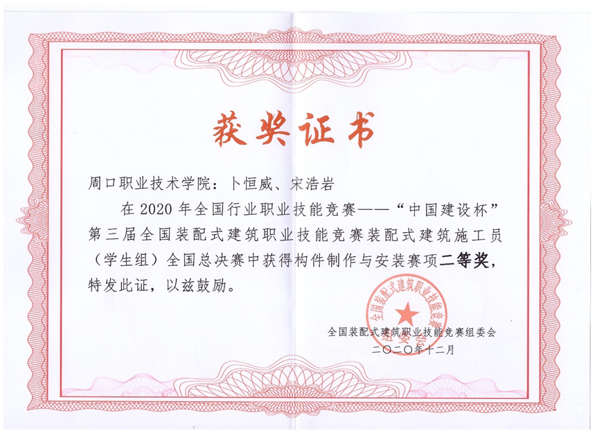 建筑工程公司三名员工近日参加2020年全国行业职业技能竞赛——“中国建设杯”第三届全国装配式建筑职业技能竞赛装配式建筑施工员(员工组)全国总决赛,其中,黄猛、于晓伟两位老师指导的卜恒威、宋浩岩同学获得构件制作与安装赛项二等奖;宁丽平、刘军两位老师指导的欧阳康辉同学获得构件深化设计赛项二等奖。